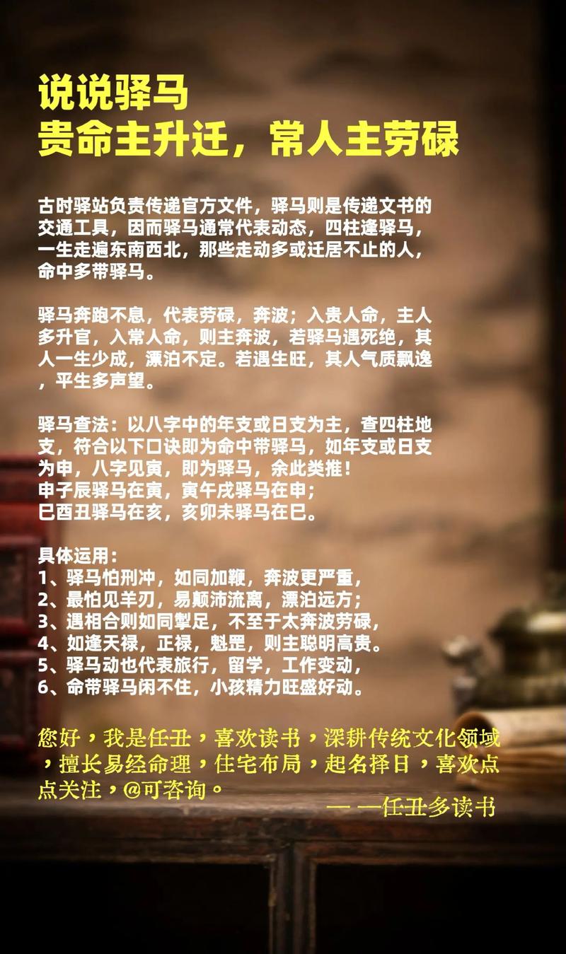 影響性格和命運:命中帶驛馬的人通常好動(dòng),喜歡奔波,可能一生中會(huì )有多次調動(dòng)或遷移。