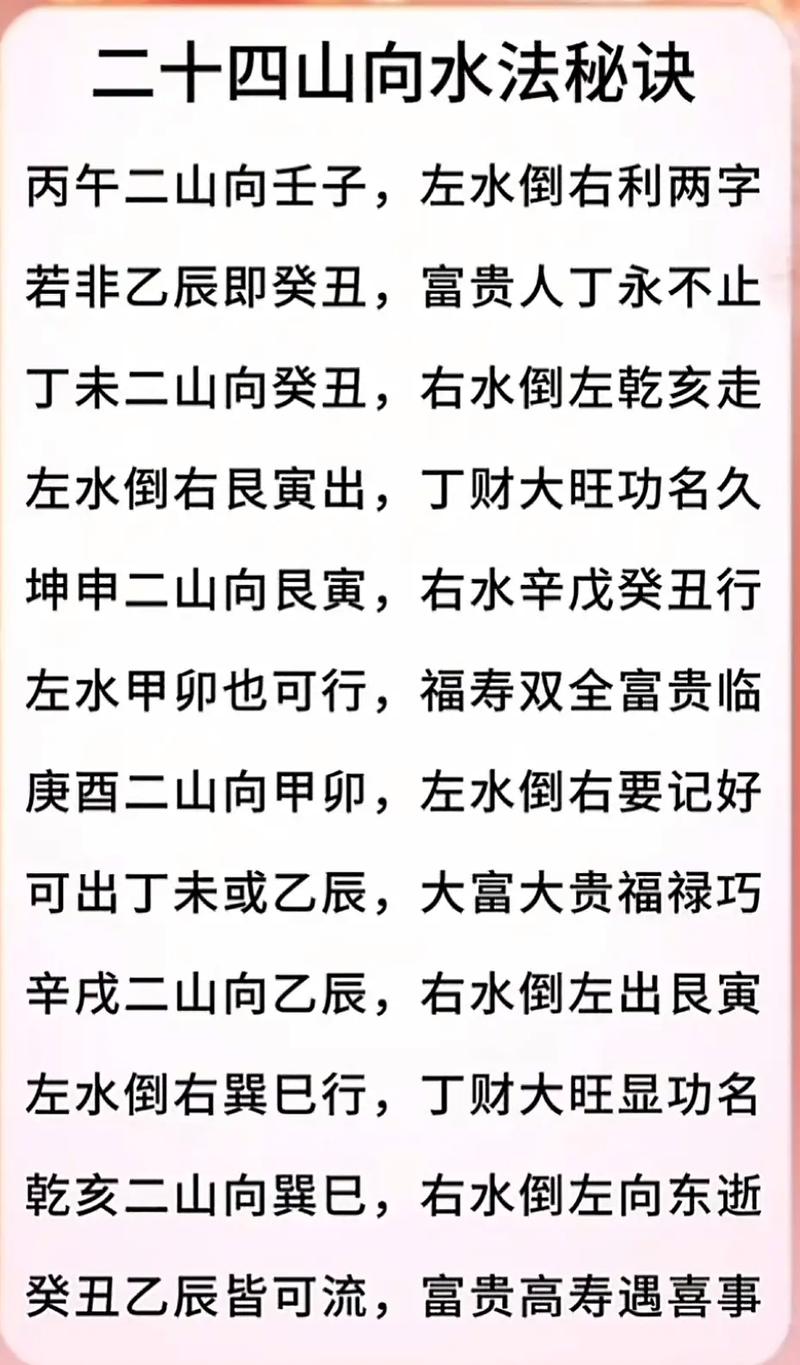 二十四坐向的水法吉兇,主要根據坐向的五行屬性和水體的方位、形狀、水質(zhì)等因素綜合判斷。以下僅列出部分坐向的吉兇水法示例,具體情況還需結合實(shí)際情況分析。