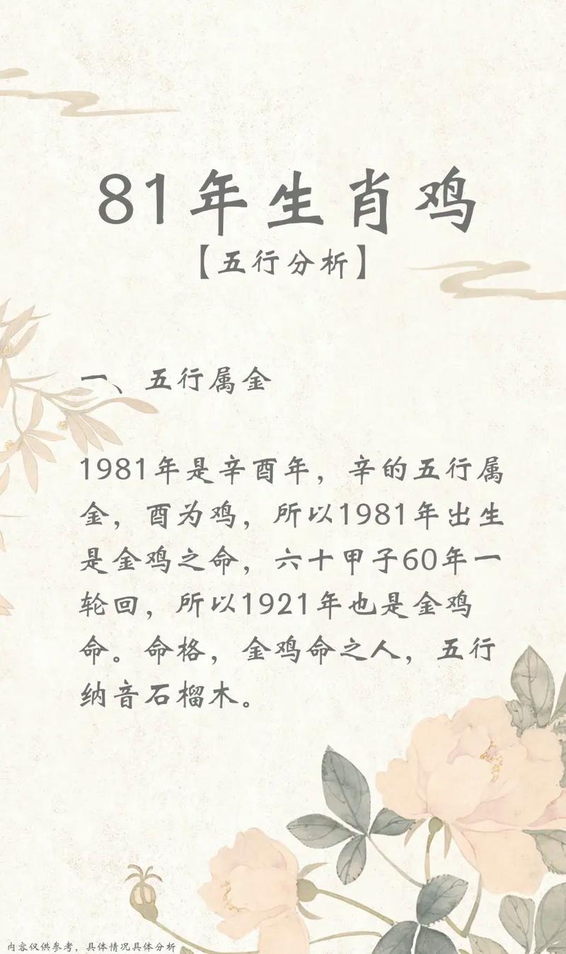 1981年出生的辛酉雞,納音石榴木,主聰敏銳利,精力充沛。其一生運勢并非一帆風(fēng)順,猶如石榴樹(shù)般,經(jīng)歷春華秋實(shí),蘊含著(zhù)起伏與挑戰。