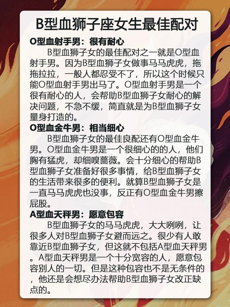 B 型血女人與獅子座的結合,成就了一位自信非凡、創(chuàng )造無(wú)限的非凡女性。她們身上洋溢著(zhù)獅子座的熱情奔放與 B 型血的灑脫不羈,形成了一股獨特的魅力。