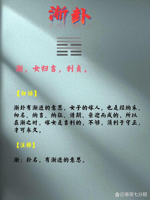 在《易經(jīng)》六十四卦中,漸卦象征著(zhù)循序漸進(jìn)、逐步發(fā)展。卦辭解釋為:“漸,進(jìn)也?!?,意指萬(wàn)物循序漸進(jìn),逐步發(fā)展。第三爻爻辭為:“進(jìn)得位,往吉,無(wú)不利?!?,是什么意思呢?