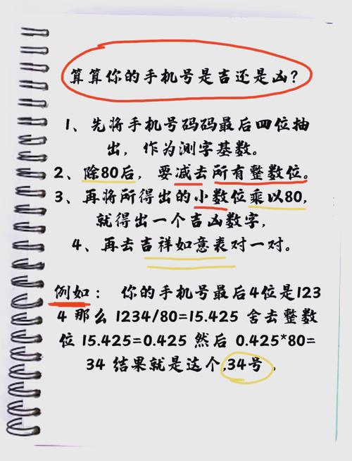 2. 后四位數字法:取手機號碼的后四位數字,進(jìn)行特定的計算,得出一個(gè)數值,然后對照吉兇表來(lái)判斷運勢。例如,將后四位數字除以80,取小數部分乘以80,得到一個(gè)數值,再根據數值對照吉兇表。